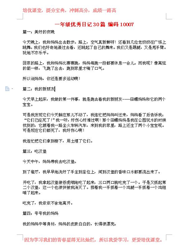 一年级优秀日记30篇 写好作文,从幼小捉起!人手一份!免费获取全套电子版,私信回复:10007