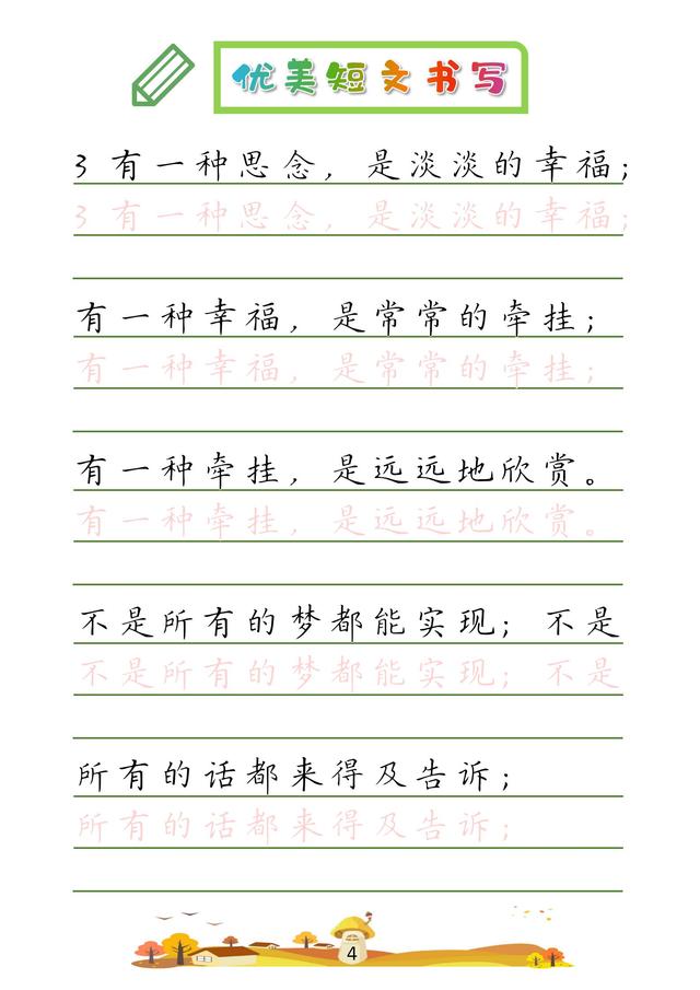精选32篇优美文章,摘抄经典段落。本套教程共52页,A4大小,可用于打印书写练习,适合有有一定基础的学员,完全脱格书写,达到学以致用!我们一直强调练字和写字要结合起来,书法要具备实用价值与审美价值,不能脱离书写的实际!