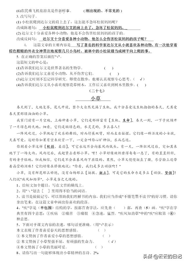 小学三年级培优阅读精选美文答案(三年级上册培优好卷A版答案)