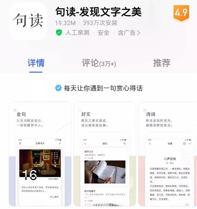 三、句读这里面包括各种金句、好文、诗词等文案内容,主打每天让你遇到一句赏心话。对于制作唯美视频的小伙伴来说,强烈推荐!